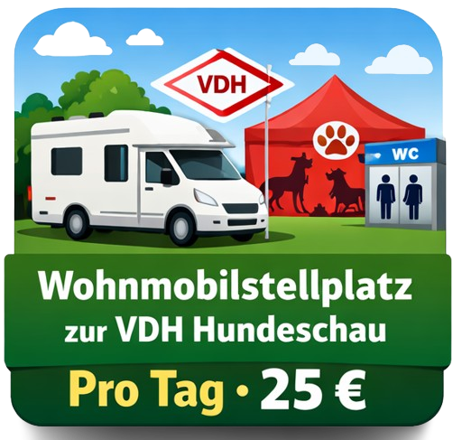 Für Besucher der VDH Hundeschau steht ein begrenztes Kontingent an Wohnmobilstellplätzen direkt am Veranstaltungsgelände zur Verfügung.